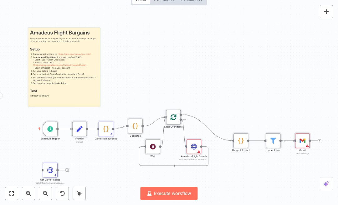 Each morning a schedule runs, loads your origin and destination, and fetches airline data from Amadeus to show real carrier names. A code step creates future dates to search, by default 7 and 14 days out. The system loops through each date and calls the Amadeus flight offers API, pausing briefly between calls to respect limits. Results are merged and cleaned, key fields like price, time, duration, and carriers are extracted, and only fares under your price move forward to Gmail for a clear, easy to read alert.
