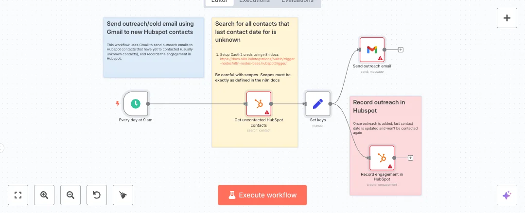 You will need Gmail and HubSpot accounts and OAuth credentials in n8n Cloud. Expect faster first touch, fewer missed leads, and a clear timeline in HubSpot. Good fits include SDR teams, small agencies, and founders who want a light daily touch without running a heavy sequence tool. Make sure your HubSpot scopes allow engagement read and write, and confirm the last contact property is set so contacts are not picked twice.