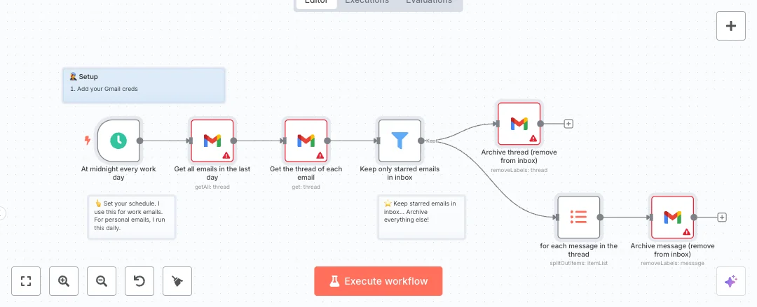 At midnight on work days, a schedule trigger starts the run. It looks at recent inbox threads from the last day in Gmail, loads each full thread, and checks if any message is starred. Threads with a star stay visible. All other threads go through a loop that removes the INBOX label on each message or at the thread level, which moves them to All Mail. By filtering with the Gmail STARRED label, your inbox shows only items you marked as important, so you can act faster in the morning.