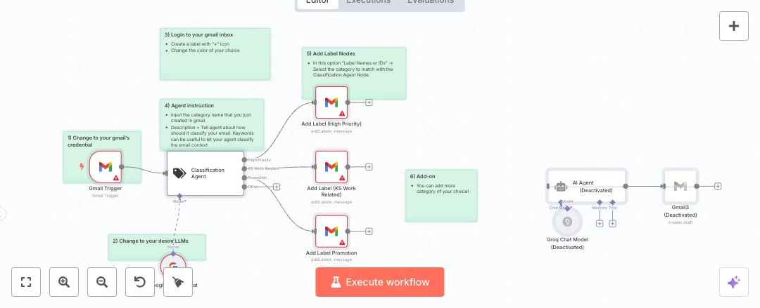 New emails are pulled from Gmail every minute. The text goes to an AI classifier powered by Google Gemini, which picks a category like High Priority, Work Related, or Promotion. Based on that choice, the flow adds the matching Gmail label automatically. At the same time, an AI Agent using a Groq model creates a first draft reply and saves it as a Gmail draft, so a human can edit and send. It uses separate models for classification and drafting to improve accuracy and tone, and you can add more categories as your workload grows.