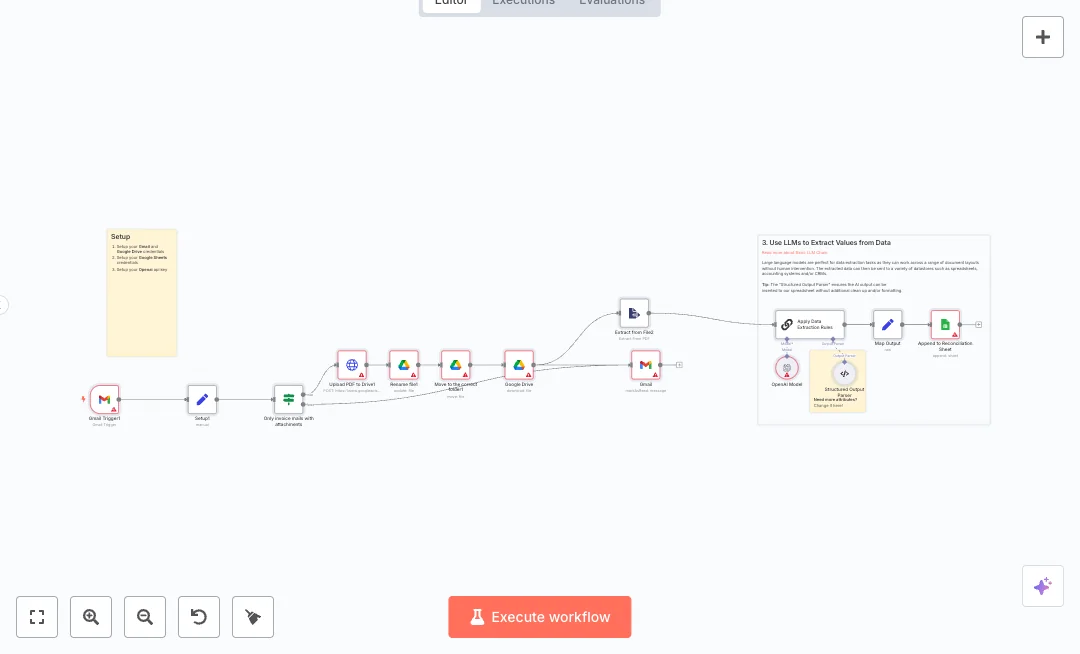 New unread emails are checked every minute. Only messages with invoice attachments continue. The file uploads to Google Drive, gets a clear name using the email subject and today’s date, and moves into your chosen folder. The system then downloads the stored PDF, converts it to text, and uses an AI model with a structured parser to pull fields like invoice number, date, vendor, and total. A mapped set of fields is appended as a new row to your reconciliation sheet. The source email is marked as read to avoid duplicates.
