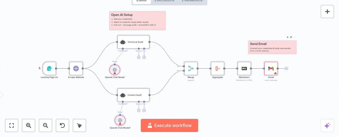 Setup needs OpenAI and Gmail access. Add credentials, set your email, and publish the form. Expect faster audits and consistent results across pages. Great for pre sales page reviews, quick launch checks, and weekly content sweeps. Cost per run depends on the model and is usually a few cents per page, about 0.3 dollars with the suggested model.