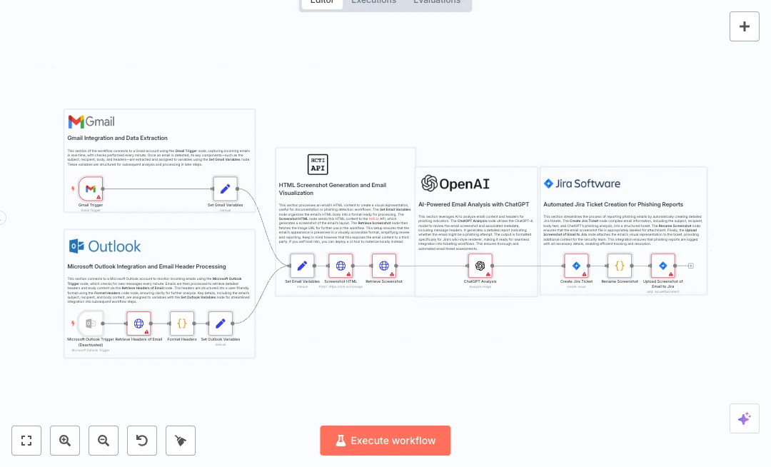 You will need accounts and credentials for Gmail, Microsoft Outlook, Jira Software Cloud, OpenAI, and the HTML CSS to Image service. Expect faster triage and fewer mistakes, often cutting review time from 15 minutes to about 2 minutes per email. Great for security teams, IT help desks, and managed service providers that handle many phishing reports across different mail systems.