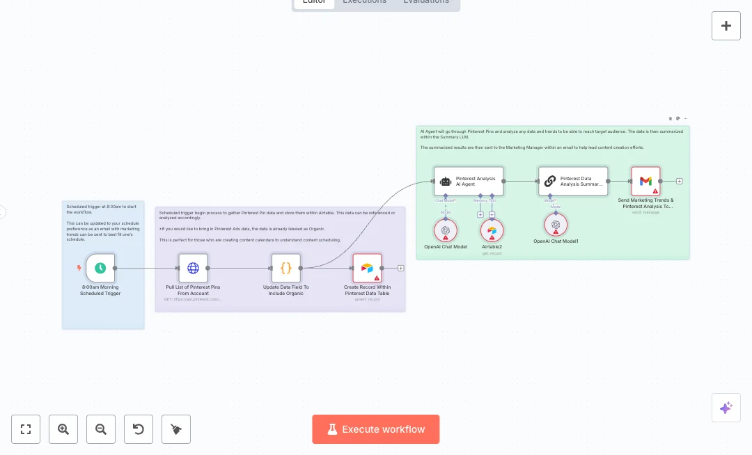 Every week at 8 am a schedule kicks off. The flow calls the Pinterest API to pull pins. A code step tags the data as Organic and formats fields like link, title, description, and created date. Records are upserted into an Airtable table, so duplicates are not added. An AI agent reads the table through the Airtable tool and an OpenAI model to spot trends and list pin ideas that match your audience. A summary model condenses the findings into clear notes. Gmail then sends the insights with the subject Pinterest Trends and Suggestions. You can change the run time and the recipient at any time.
