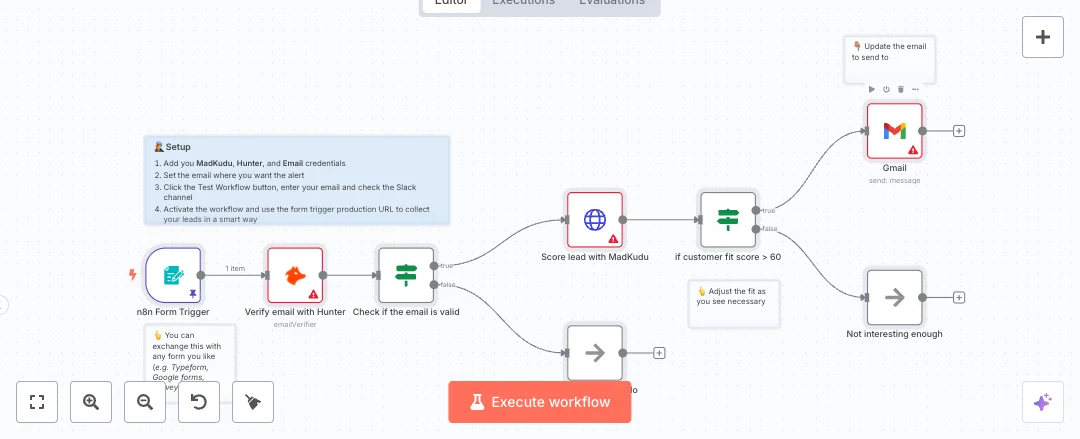 To set this up, connect Gmail, Hunter, and MadKudu credentials, update the email field mapping, and set your score threshold. Expect faster triage, fewer manual checks, and quicker follow up on the right leads. Use it on a contact page, demo request form, or event registration page.