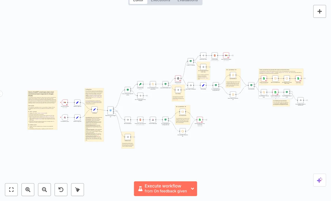 The flow starts with Gmail receiving a message. It parses the body, checks token limits, and uses OpenAI to draft a reply with a size cap. The reply goes back through Gmail with a feedback link that calls an n8n webhook and shows a thank you page. All details are logged to Google Sheets, including the email, the AI response, a unique ID, and any feedback. If a sheet does not exist, it creates one and stores its ID so future runs update the same sheet.