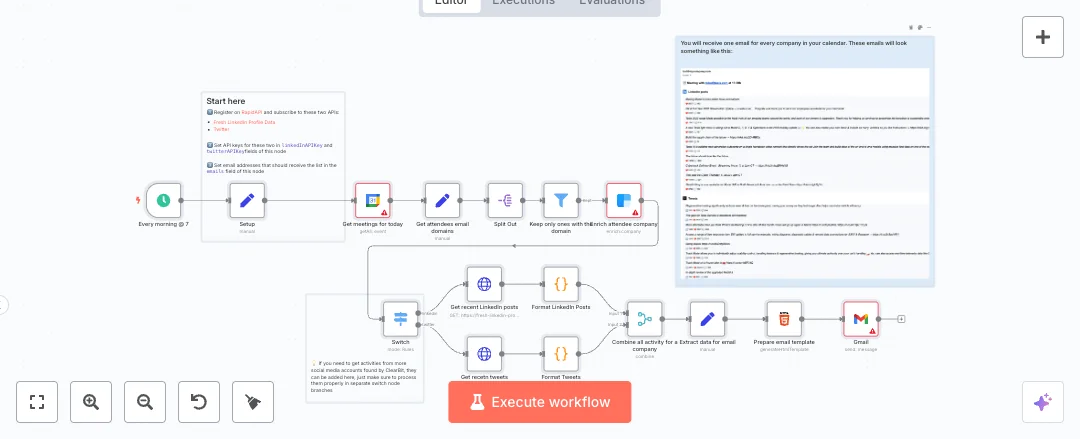 At 7 am the flow checks your Google Calendar for today’s meetings. It pulls attendee email domains, skips the organizer, and uses Clearbit to find the company name and social handles. A switch then calls two data sources on RapidAPI to fetch recent LinkedIn posts and recent tweets. Code steps turn that content into clean HTML, a merge step brings all posts together, and a template wraps it into a short report. Gmail sends the message to the recipients you set.