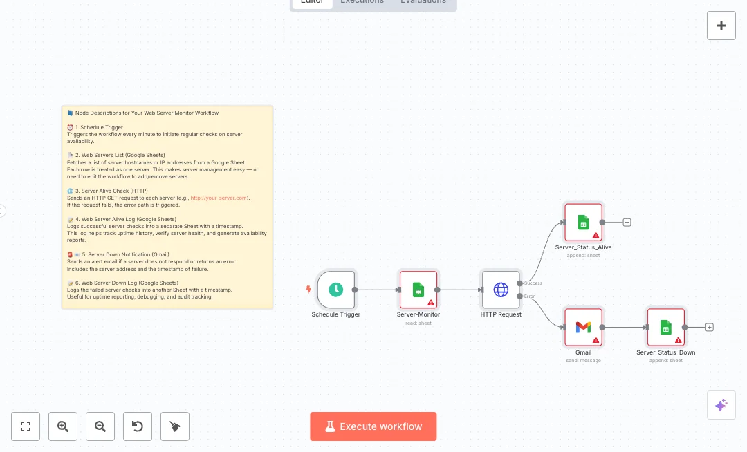 A schedule runs every minute and reads a server list from a Google Sheets tab. For each row, an HTTP request tries to reach the server address using the value in the Server column. Successful checks are logged to a separate sheet with a date stamp and the server value, building an uptime history you can filter and chart. When a request fails, Gmail sends an alert with the server name and time, then a second sheet stores the downtime record for audits and root cause review.