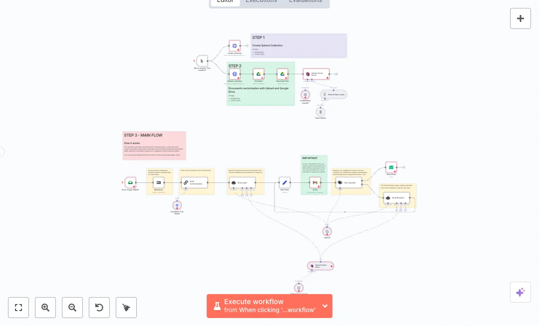 New emails arrive through IMAP and are converted to clean Markdown. A summary is created so the model focuses on what matters. Company files from Google Drive are indexed into Qdrant, and an OpenAI agent uses that knowledge to write a reply under 100 words. A Gmail step sends the draft to a reviewer and waits for free text feedback. A classifier decides if the draft is approved. If not, a reviewer agent rewrites the message using the feedback. The final email is sent by SMTP to the original sender.