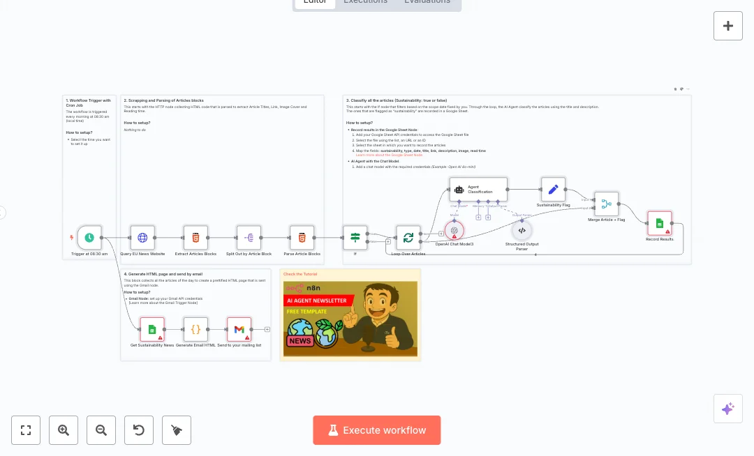 Get a daily email of EU sustainability stories without manual work. At 08:30 the system pulls new articles, filters them with AI, and builds a clean digest. Your audience gets timely news in one message.