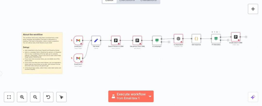 New messages arrive from two Gmail inbox triggers that poll every minute. The email text is captured and the sender address is matched to a person in the CRM. Only contacts tagged as in campaign continue. An AI check using GPT 4 reads the reply and decides if the lead wants a meeting and gives a short reason. A small code step extracts the interested and reason values from the AI output. If interest equals yes, a deal is created in the CRM using the contact name in the title. You can add more inboxes by duplicating the Gmail trigger and linking it to the same flow.