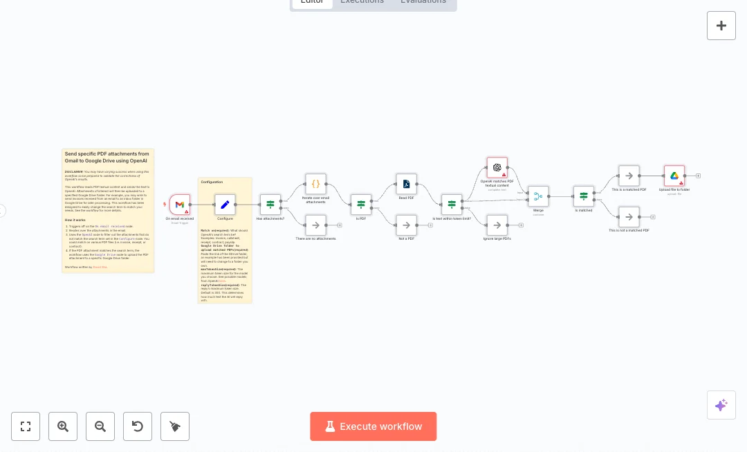 Here is how it works. A Gmail trigger grabs new emails and downloads attachments. A code step splits multiple attachments so each file is checked on its own. Non PDF files are skipped. The PDF text is extracted and checked against a safe token limit. OpenAI then looks at the text and answers true or false based on a match term you set, like invoice or payslip. A merge and filter step pairs the AI answer with the file and sends matching PDFs to your chosen Google Drive folder. Large files and non matches are ignored.
