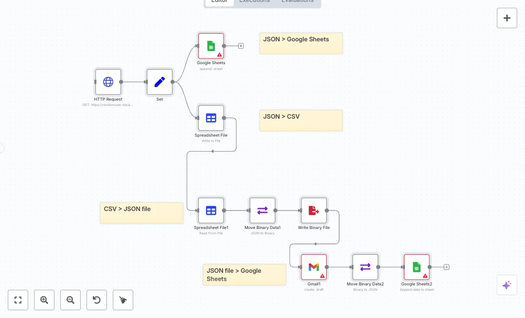 The flow pulls sample users from an API, maps clean fields like full name and country, and writes rows to Google Sheets. It also creates a CSV file, turns that CSV back into JSON, saves the JSON to disk, and emails it as an attachment with Gmail. The email attachment is then read back into the workflow and added to Google Sheets again. Key parts include HTTP Request, Set for field mapping, Google Sheets append, two Spreadsheet File steps for format changes, Move Binary Data for file handling, Write Binary File for storage, and Gmail to send the file.