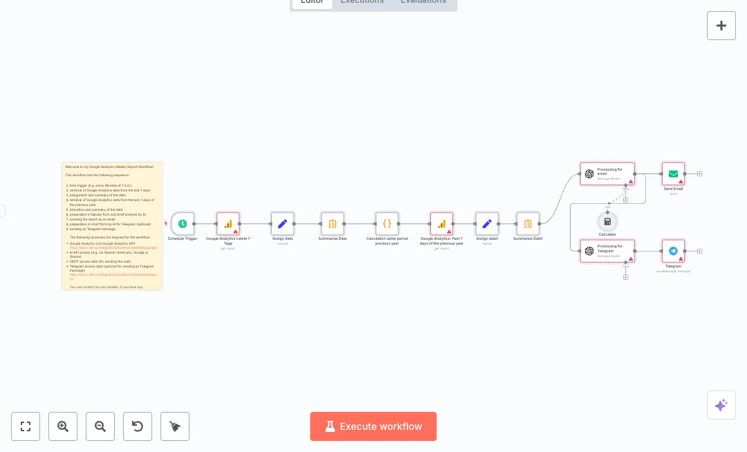 It runs on a weekly schedule at a set time. First it pulls the last seven days of GA4 metrics, then maps fields and sums the numbers. A code step calculates the matching seven day window from the previous year and triggers a second GA4 pull. Two summary steps aggregate totals and averages. An AI step builds an easy table with current values, last year values, and percent change. The email node sends the HTML report, and a second AI step turns it into short plain text for Telegram.