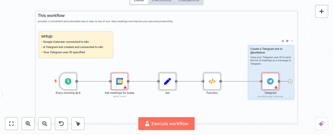 Connect your Google account and your Telegram bot in n8n, then pick the calendar and paste your Telegram chat ID. You will get one clear summary every morning that cuts 5 to 10 minutes of manual checks and lowers missed meetings. Change the trigger hour if you need a different time or switch the calendar ID for another team or room. Many people use it for personal planning, team standups, and shared meeting rooms.