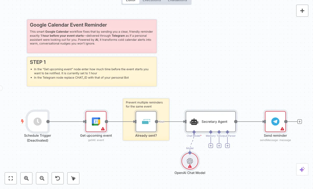 Every minute, a timer checks Google Calendar for events that begin exactly one hour from now. It pulls up to five events in that window, removes anything already sent, and uses an AI assistant to write a short, friendly note with the event name, time, location, and any notes. The message then goes straight to your Telegram chat. The narrow time window prevents early or late alerts, and the dedupe step avoids repeat pings.