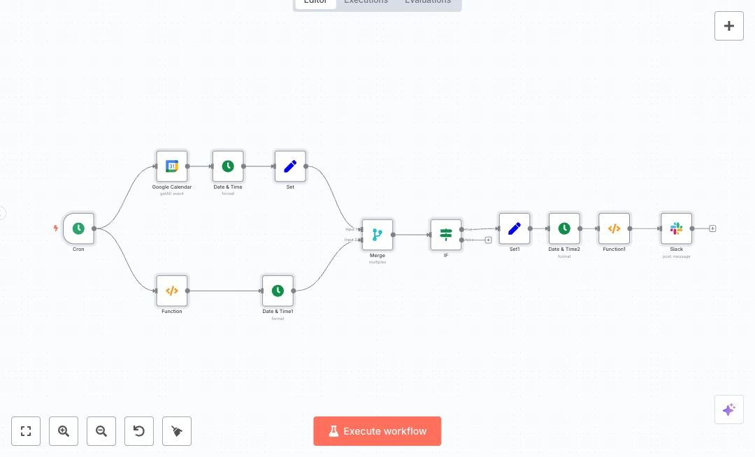 A schedule trigger runs at 6 AM and pulls all events from Google Calendar. Times are converted to the Asia Qatar timezone and dates are formatted so they match. A check keeps only items that happen today. The Merge step attaches today’s date to each event, and Set steps map clean fields like name, time, and link. Another time format step outputs HH:mm for easy reading. A message builder creates a simple list and posts it to the Slack channel you choose.