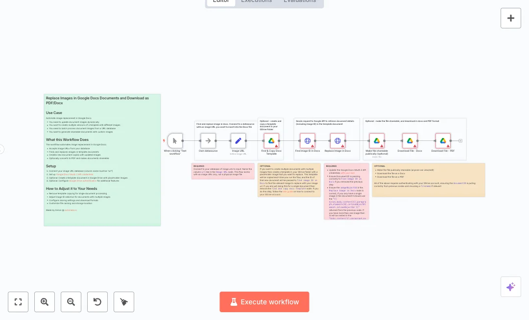 The run starts with a manual test. A simple data step provides an image url field. A Google Drive node can copy a template so each run gets a new file. The Google Docs API is called to read the document and find the image ID. Another call swaps the image with your URL. You can then make the file shareable and download Docx and PDF versions.