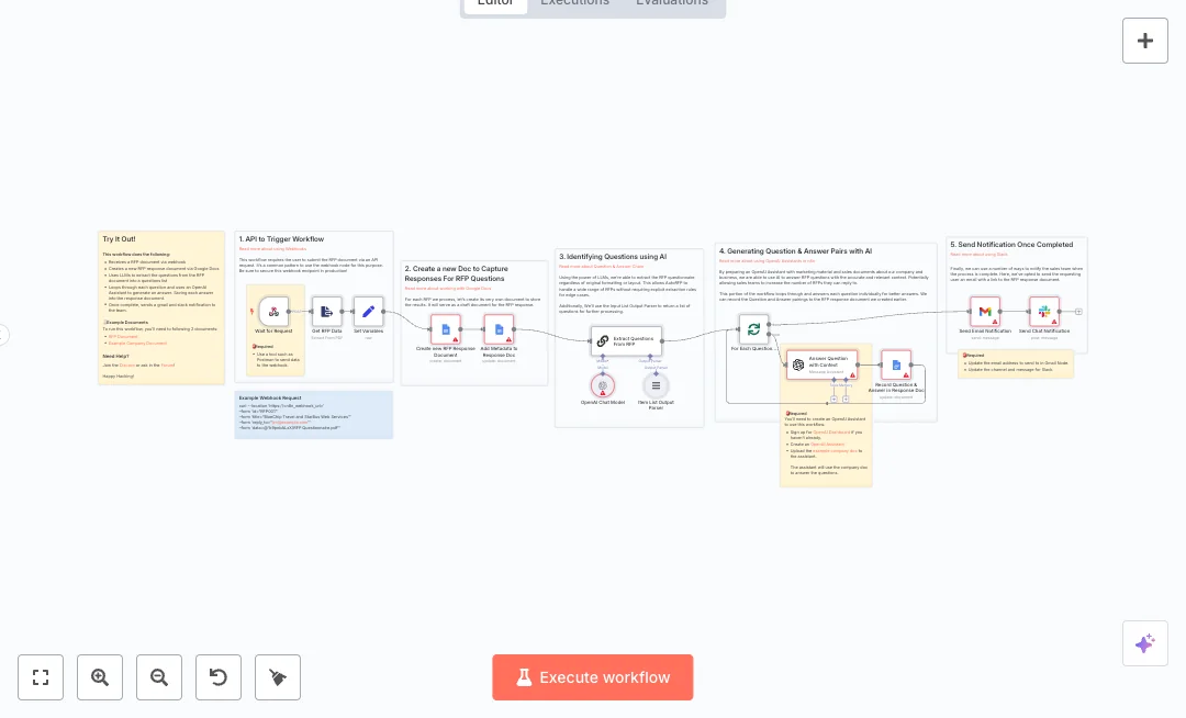 Here is how it runs end to end. A webhook collects the uploaded PDF and basic fields like title, ID, and reply email. The file text is extracted and sent to an AI model that pulls out the list of questions. The workflow loops through each question and uses an OpenAI assistant with your company content to draft accurate answers. It creates a new Google Doc, adds metadata, records each question and answer, and then sends a Gmail message and a Slack update with the document link. This design handles messy formats, works in batches, and keeps everything in one place for review.