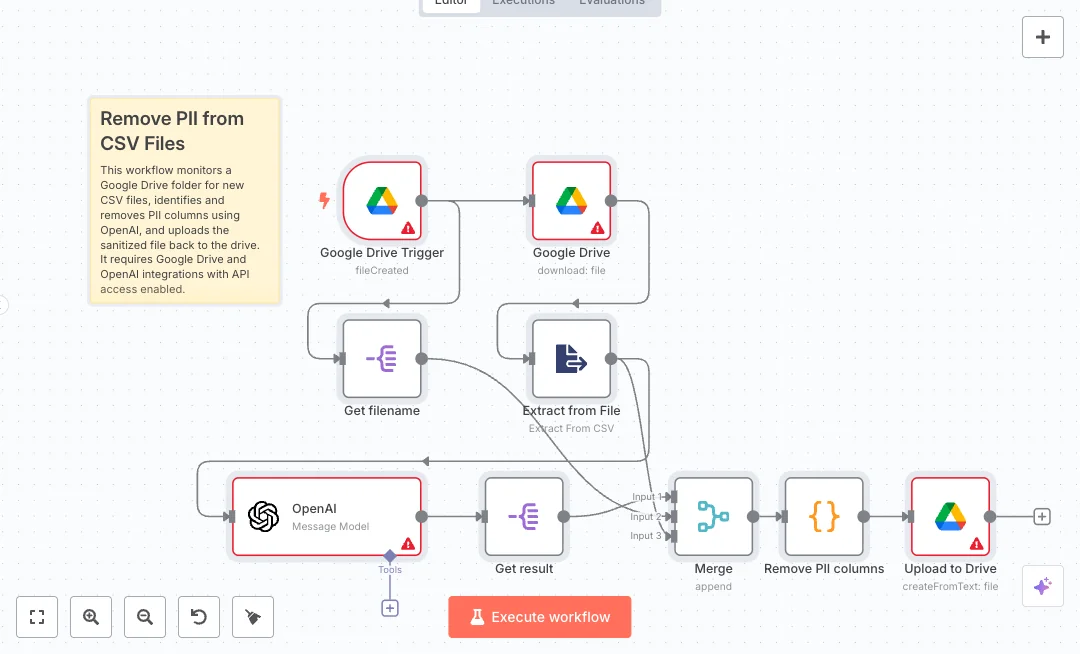 Keep contact lists and exports safe by removing personal data before anyone shares them. This workflow watches a Google Drive folder for new CSV files, finds columns with personal information, deletes those columns, and saves a clean file back to Drive. It suits teams that handle sign ups, lead lists, or survey data and need a simple way to protect privacy.