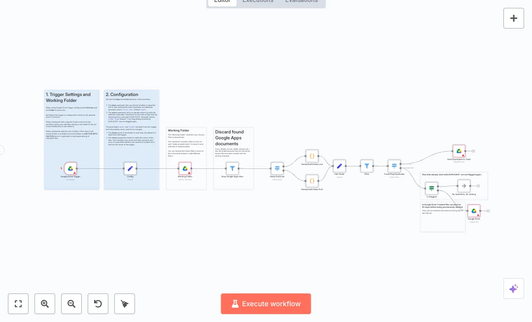 The flow starts with a Google Drive trigger that checks the selected folder every 15 minutes for new uploads. A folder scan gathers files at depth level one and removes Google Docs types, since those are links and cannot be compared like real files. A setting decides whether to keep the earliest or latest file, and a code step sorts by created time to tag duplicates. A filter passes only items marked as duplicates. Another setting chooses the action path to either delete the extras or rename them. A safety check skips files already marked so nothing gets renamed twice. Owner and folder values come from the trigger to avoid acting on files you do not own. An Edit Fields step keeps the flags consistent, and a NoOp step cleanly ends already flagged items.