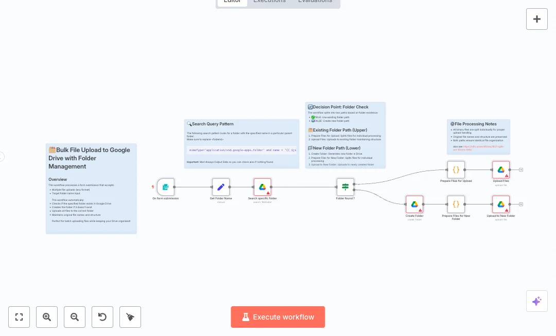 A form submission starts the flow with two inputs, files and folder name. The logic checks Google Drive to see if the folder already exists inside a chosen parent folder. If it exists, each file is split and uploaded to that folder with its original name. If it does not exist, a new folder is created first, then the same upload steps run. Two code steps break out each binary file so every upload is handled cleanly. This keeps structure tidy and removes manual sorting and dragging.
