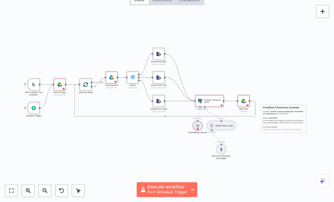Two triggers control the run, a manual test and a daily schedule at 3 AM. The flow lists a source folder in Google Drive, loops through each file, downloads it, and routes it by type. PDFs, text, and JSON are parsed with the right extractor. The text is split into small chunks with 50 character overlap, turned into embeddings with OpenAI text embedding 3 small, and inserted into a PostgreSQL table with PGVector. After indexing, the file is moved to a processed folder so it will not be handled again.