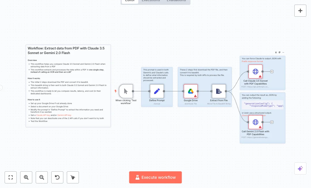 Setup needs access to Google Drive plus API keys for Anthropic and Google Gemini. Pick the PDF, edit the prompt for the fields you want, and run a test to review both outputs. Teams can use this to extract VAT IDs, totals, customer fields, and more. Expect big time savings on document intake and fewer errors from retyping. If you only want one AI, disable the other call to control cost.