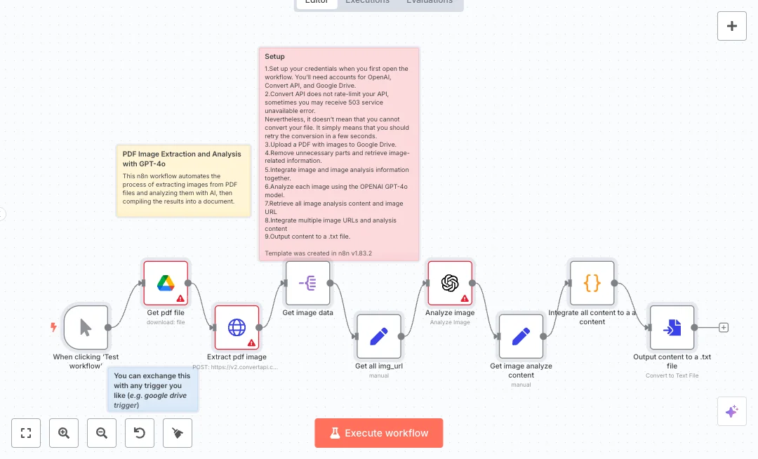 Under the hood, a manual start fetches a PDF from Google Drive. An HTTP call to ConvertAPI extracts images as JPG files. A split step creates one item for each image. Each image URL is fed to OpenAI GPT 4o with a prompt for detailed analysis. The output pairs each image link with the AI summary, then a code step merges all results. A final node generates a single txt file ready for download or sharing.