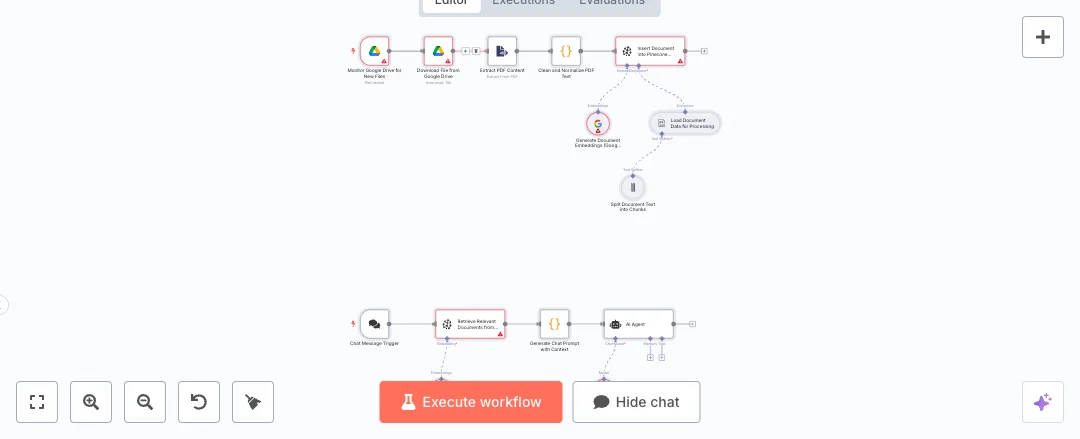 Set the Drive folder to watch and enter your Pinecone index name. Add API keys for Google Gemini and OpenRouter, then test by uploading a PDF and sending a sample question to the chat endpoint. Expect faster replies, fewer repeat tickets, and a self service channel that grows as your library grows. This setup works for help centers, internal wikis, and product knowledge for frontline teams.
