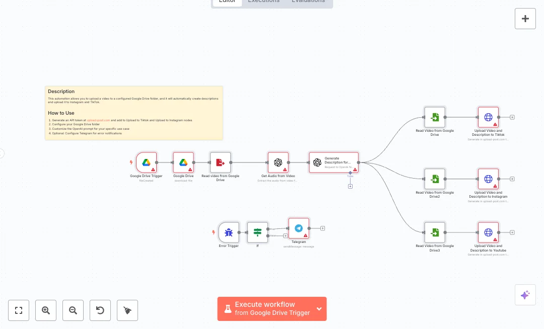 A Google Drive trigger checks the folder every minute and downloads new files. The flow saves the video to disk, transcribes the audio with OpenAI, and then writes a short caption using a clear prompt. The same video is attached to three API calls that send the file and caption to the Upload Post service for each platform. Filenames are cleaned to remove spaces so attachments load correctly, and the AI text maps to the title field in each request. If anything fails during the run, a Telegram message alerts your team right away.
