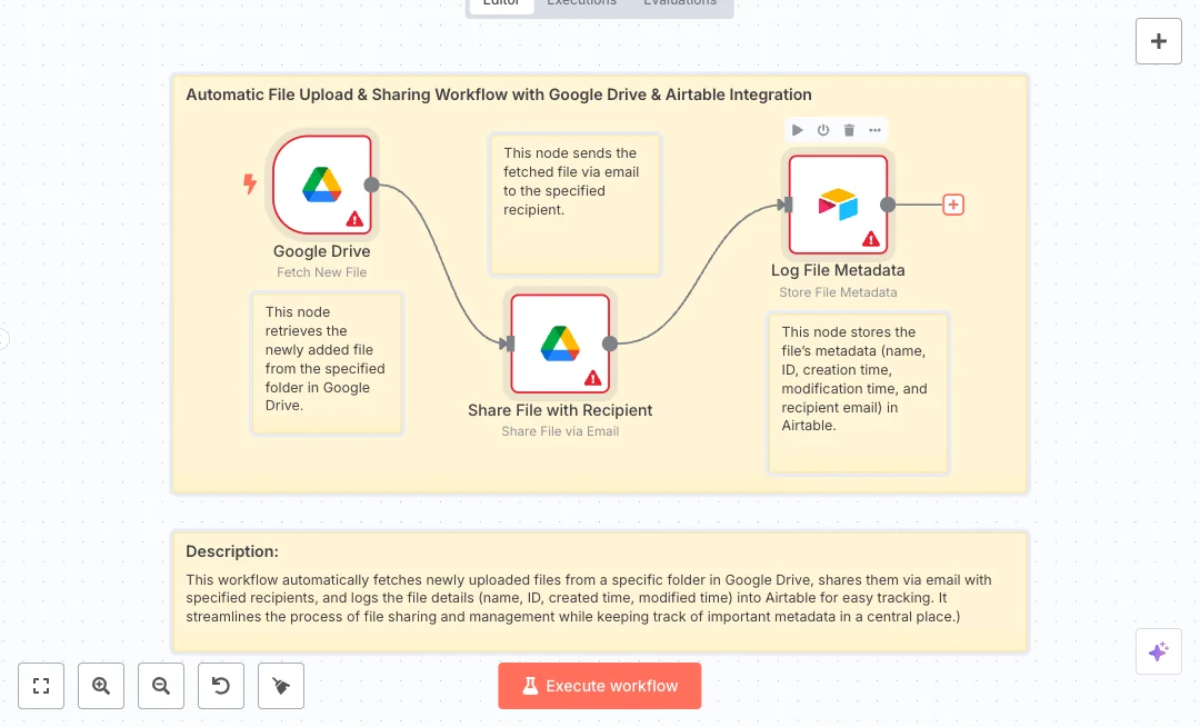 New files in your Google Drive need to reach the right person fast. This setup finds each new file in a chosen folder, shares it with a set email, and records key details in Airtable for tracking. Teams that move documents every day will value the speed and clean audit trail.