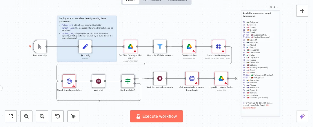 The flow starts on demand with a manual run. A config step holds three fields, the Drive folder link, the target language code, and an optional source language code. It lists files in the folder, keeps only PDFs, and downloads each file. Each document is sent to DeepL for translation. The system waits five seconds, checks the job status, and loops until the file is ready. A short two second pause between files helps with rate limits. When the result is ready, the translated file is downloaded and uploaded back to the same Drive folder.