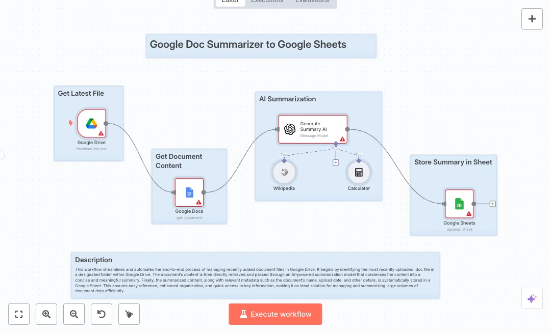 A Google Drive trigger watches a selected folder every minute for newly created files. When a new Google Doc appears, a Google Docs node pulls the full text using the file id. An AI node using the GPT 4o mini model turns that text into a clear summary. The flow then appends the summary, the document name, and the editor details to a target sheet. Optional Wikipedia and Calculator tools can help the AI explain terms or do quick math when needed.