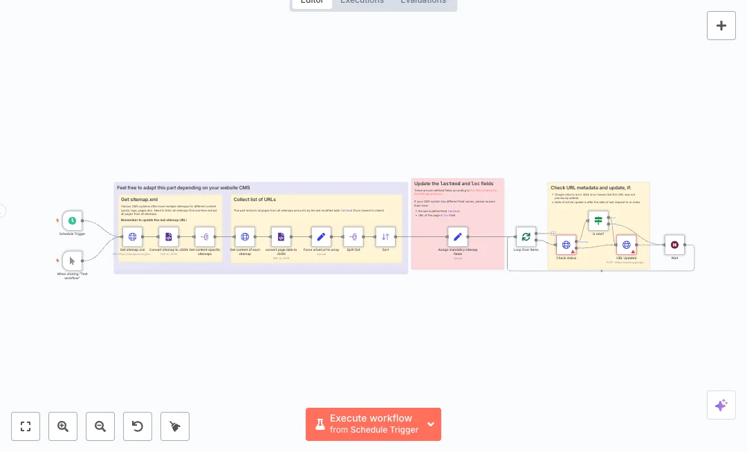 A daily schedule pulls your sitemap.xml, detects sitemap index files, and fetches each content sitemap. XML is converted to JSON, URLs are normalized, and items are sorted by last modified date. The flow loops through each URL in batches, checks the Google Indexing API for metadata, and compares the page update time with the last request time. If Google returns an error or the page changed since the last request, it sends URL_UPDATED. A short random wait between calls helps avoid rate limits. You can also run a manual test anytime.