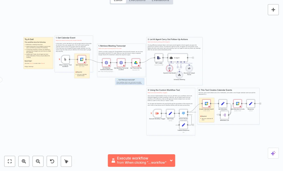 Here is how it runs. A manual or tool trigger loads the original calendar event to grab the meeting code. It calls the Google Meet API to find the transcript, downloads it from Google Drive, and converts it to PDF for reading. The text is sent to an AI model with strict output rules. An AI Agent then chooses if a follow up meeting is needed and passes only the details to a custom tool. A router creates the event in Google Calendar, splits the attendee list, and updates the invite for each person. A fallback path returns a clear error if the tool route is missing.