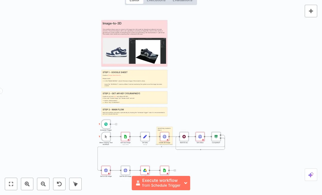 Turn image links in a Google Sheet into ready 3D models. The flow adds the model link back to the same row and saves the .glb file to Google Drive. Useful for product teams, ecommerce, and marketing who need many 3D assets fast.