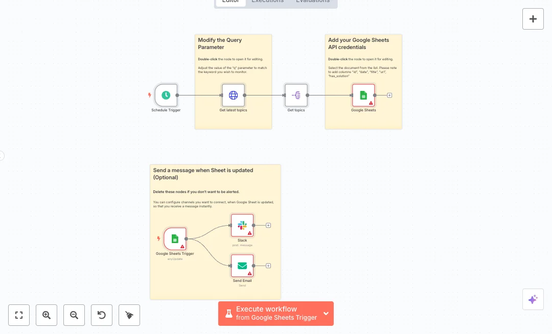 A schedule calls a search endpoint with your keyword, pulls the latest topics, and splits the list into single items. Each item is written to a Google Sheet with id, date, title, url, and has_solution fields using append or update, which helps avoid duplicates. A Google Sheets Trigger watches the same sheet every minute and sends a short Slack message and a simple email when new data lands. This creates a live tracker that your team can filter, sort, and share easily.