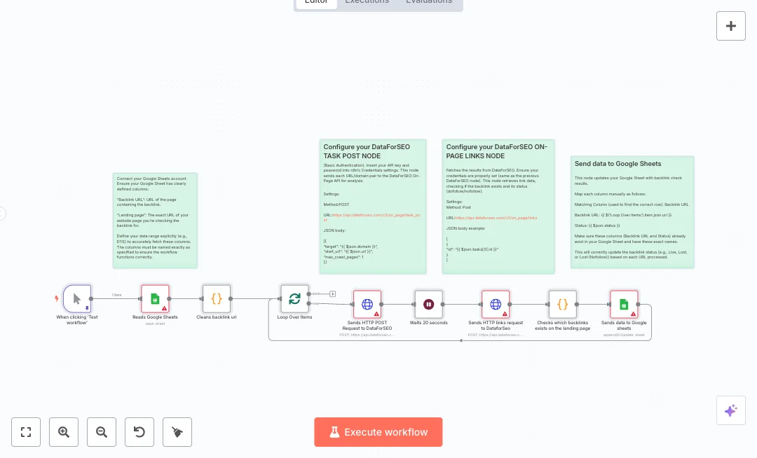 Setup is simple. You need a Google Sheets account and a DataForSEO account, then add both credentials in n8n. Select your sheet, set the range to the correct columns, and keep the exact column names Backlink URL and Landing page. Expect a big time savings when checking many links. Teams use this to speed up link reclamation, vendor link tracking, and partner link reviews.