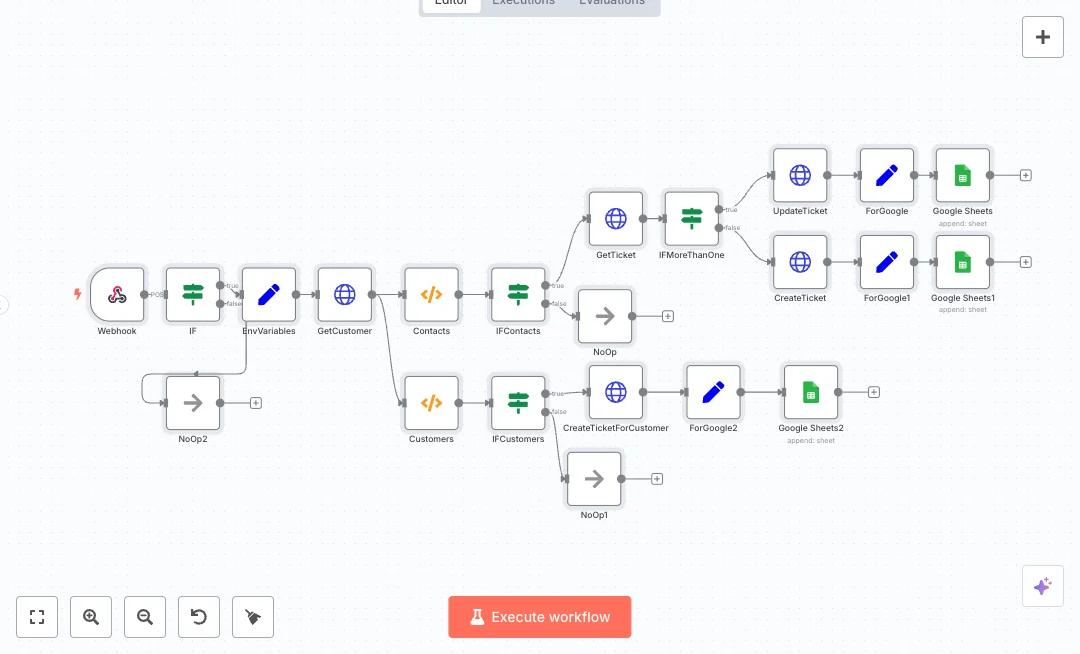 A webhook receives a POST with the caller number and a call id. The flow searches your ticketing system for a matching contact or customer using the phone number. If there is an open ticket for that contact, it posts a comment on that ticket. If no open ticket exists, it creates a new one. In both cases, it writes the call id and the ticket id to a Google Sheet for fast reporting. The workflow uses conditions to route between contact level and customer level matches and keeps the logic clear for each case.