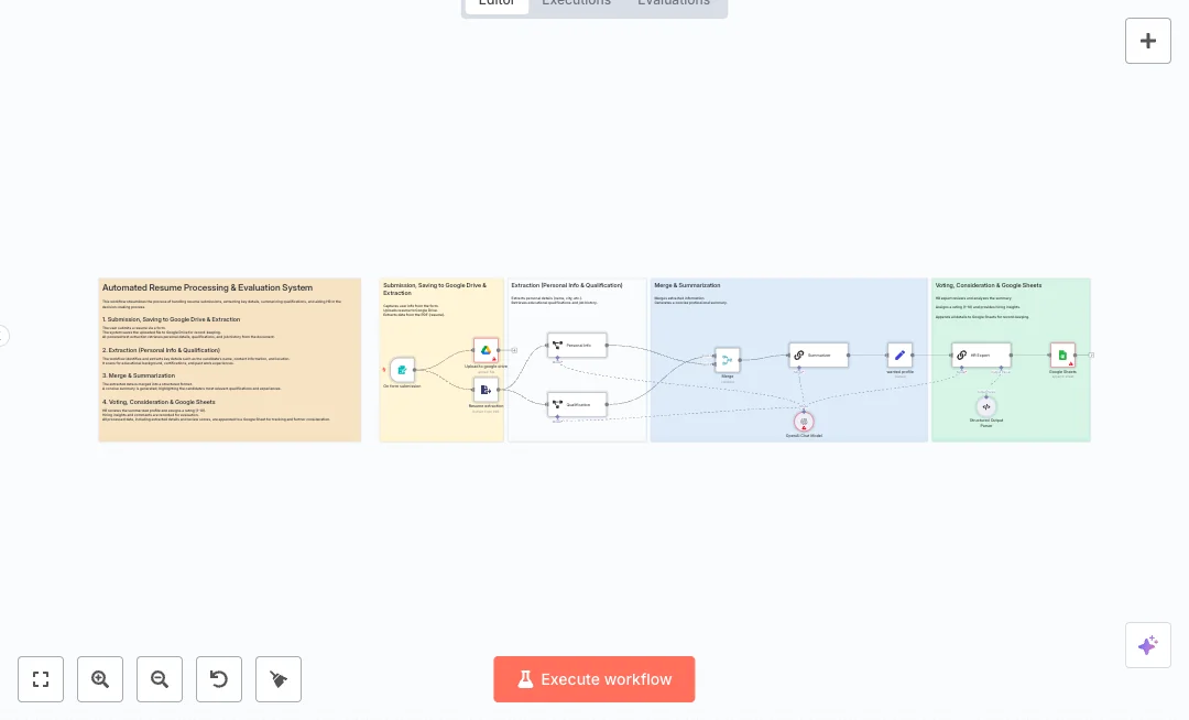 When a candidate submits the form, the file is saved to Google Drive. Text is pulled from the resume and two AI extractors capture personal info and qualifications. Their results are merged and summarized. A desired profile is set, then an HR expert model compares the summary to that profile, assigns a score from 1 to 10, and explains why. A structured parser keeps vote and consideration fields clean, and all fields are appended to Google Sheets for tracking. The sheet can hold contact info, city, birthdate, rating, and review notes.