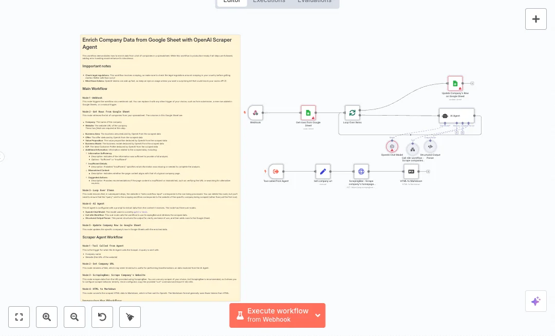 A webhook starts the run. Rows are pulled from your sheet, then handled one by one using a loop. An AI agent calls a helper workflow that uses ScrapingBee to fetch the page, converts HTML to markdown to lower token use, then sends the text to an OpenAI chat model. A structured parser returns clean fields that map back to the same row so your sheet stays updated without copy and paste. The agent also flags missing or mismatched content so you know what to review.