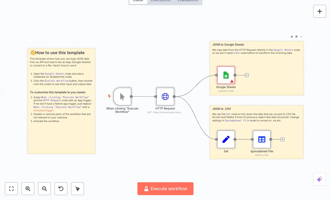 The flow starts with a manual run, then calls an API to fetch JSON data. From there, one path maps fields straight into a Google Sheets table and appends new rows. A second path trims and flattens the same JSON with a Set step, then creates a CSV file using a Spreadsheet File step. You can keep both outputs at once, so your sheet stays updated while a CSV is generated for download or sharing. Direct mapping to Sheets keeps things simple. The CSV path gives you tight control over which fields you include.
