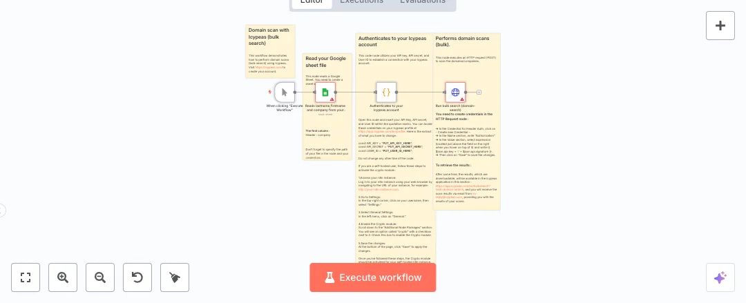 Here is how it works. You start the run manually. The Google Sheets node reads the first column named company. A code node uses your API key, API secret, and user ID to build a signed request with a timestamp. The HTTP Request node sends a POST to the bulk search endpoint with the job name, your user ID, and the sheet data. The service processes the list in the background. Results are delivered in the app and by email when ready.