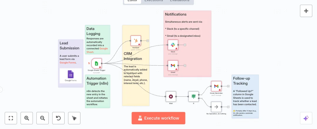 Setup is simple for teams that already use Google Forms and Google Sheets to collect leads. Expect faster first responses, fewer missed leads, and consistent CRM records. It works well for small sales teams who want a sheet based follow up tracker with timed nudges. Adjust the wait time, Slack channel, and email settings to match your process.