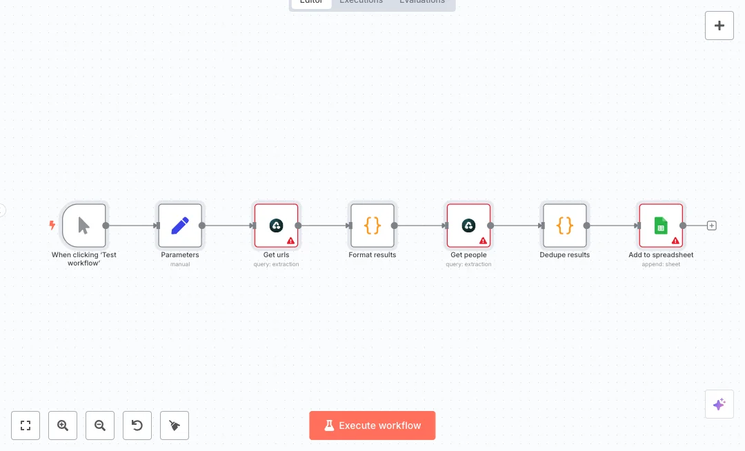 Find the right people faster. The automation searches the web for list pages, pulls names and profile links, and saves clean records to Google Sheets. Useful for influencer outreach, speaker sourcing, or partner research.