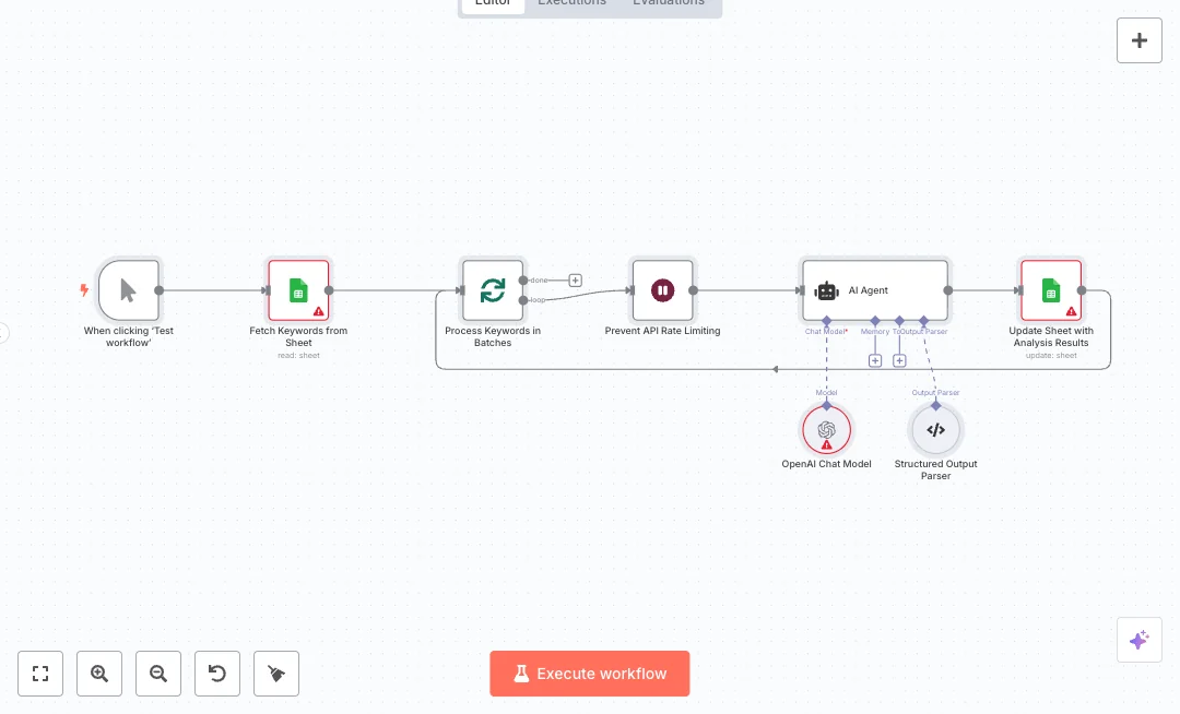 When you click run, the flow reads rows from your sheet, processes six keywords at a time, and adds a short pause to avoid API limits. An AI model from OpenAI reviews each keyword using a simple rule and returns a yes or no in a structured format. The result is written back to the Service? column next to the matching Number. The loop continues until all items are checked, so your sheet stays clean and complete.