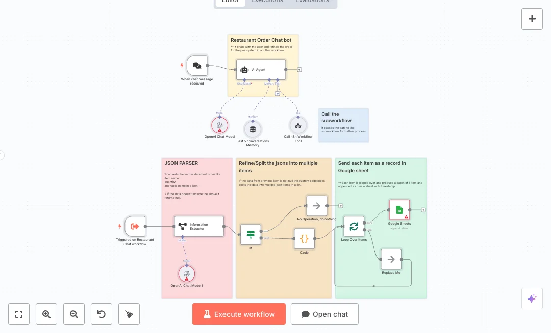 The flow starts when a chat message hits a public webhook. An AI Agent with the OpenAI model and short memory talks with the guest, fixes mistakes, and confirms details. The Information Extractor and a Python Code step pull items, quantities, and table, then build a tidy list. An If check blocks bad input, a loop sends each item to Google Sheets with a timestamp, and a tool node forwards the final text to a subworkflow that prepares the POS steps. A second trigger also lets other workflows feed structured text into the same pipeline.