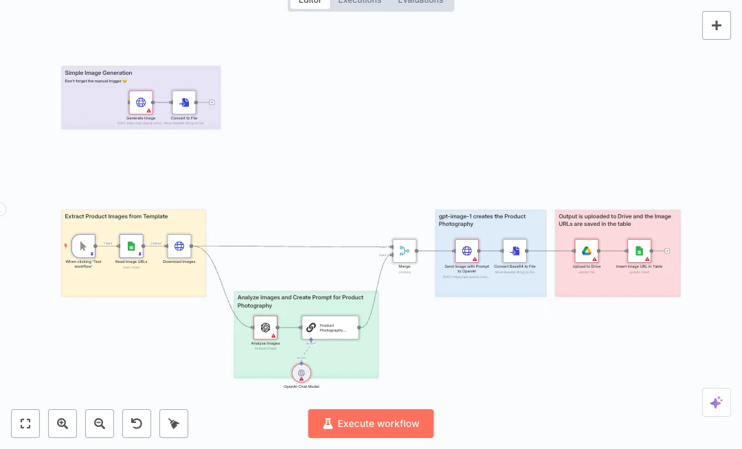 Once you start the run, the flow reads image URLs from a sheet, downloads each file, and asks an AI model to describe the image in under five words. That short description then powers a prompt builder that crafts a clear product photography prompt. The original image and the new prompt are paired by position and sent to an AI image edit model to create the enhanced photo. The file is returned as base64, converted to a real file, uploaded into a Drive folder, and the web link plus the exact prompt are written back to the same row for full traceability. A simple image generation path is also included for quick tests.