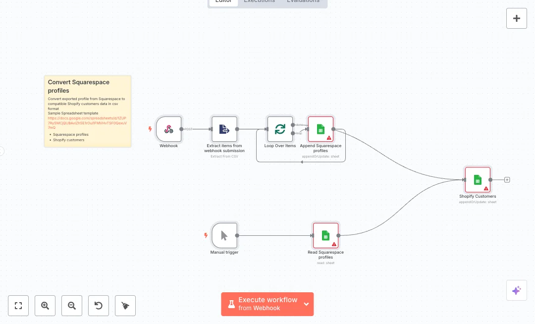 A webhook receives the CSV file and the file extractor turns it into rows. Records flow in batches of 1000 to a Squarespace profiles tab in Google Sheets, then get mapped into a Shopify customers tab. The mapping covers email, phone, names, and address fields. Tags are added automatically, and a tag changes when a last order date is present. A manual trigger path can also push existing rows from the profiles tab into the Shopify sheet without using the webhook.